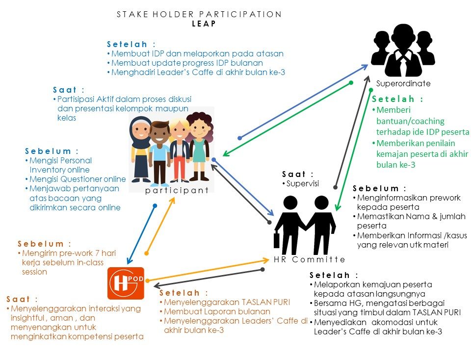 Dalam Program LEAP, program meliputi pre-work & Online inventory, Inclass Training dan dilanjutkan dengan Monitoring project selama 3 bulan pasca training. Dalam kegiatan ini melibatkan beberapa pihak yaitu Tim Humanis, Tim HR Blanja.com dan peserta beserta atasan yang bersangkutan.